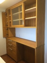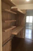 奥様のワーキングコーナーも新設し、棚は杉板(30mm)、机は桧板(35mm)で製作し、机の下に収まるようにキャスター付きの脇机も造っています。