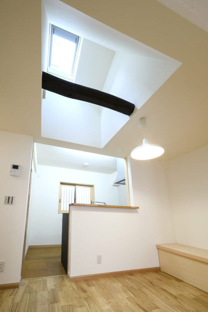伝統的な京町家は座敷の連続で構成されていますが、今の生活のあり方、子育ての有り様などを考えると、やはり細かい座敷の連続ではなく、限りある床面積でも家族が集まれる場はできるだけ広く、つながりが感じられるように、ゆるい区切りはあるけれども視覚は連続できるヒノキの耐力格子壁をダイニングと居間の間に設けました。また建物が密集しているこの場所では天窓からの光は室内空間を豊かにします。