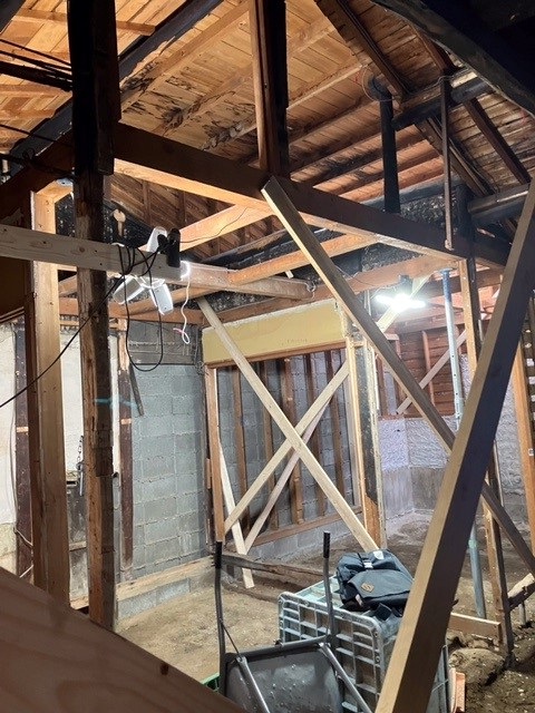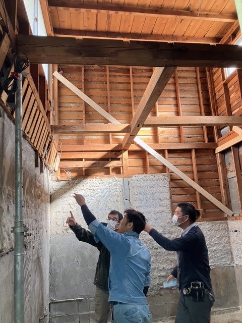 その他、小屋裏で筋交い補強をし、2階床構面を新設し、耐震性能を向上させています。さらに、内壁を取ってみるといろいろなところで傷みもありました。それら一つ一つについて経験を積んだ職人さんたちとともに補強方法を考え、腐っている材は替えたり、新たに構造材を足したりと言うようなことを行っています。
